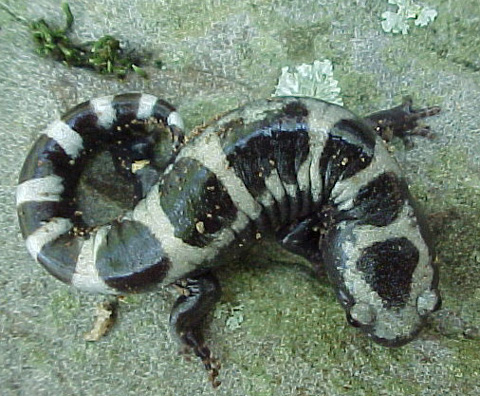 Johnson Co., Illinois They are not as brightly colored as a Cave or Longtailed Salamander, yet opacum is to my mind one of the most beautiful of all salamanders. The females are marked light grey and black, while males are usually white and black. Females are usually larger than males. There is a certain place, a jumble of rocks on the side of a trail, where it's usually no trouble to find a Marbled Salamander or two, even during the dry summer months. Apparently a bit of moisture is enough to hold them near the surface, unlike Spotted and Tiger Salamanders which disappear into the ground after the spring rains cease. Rather than migrate to vernal pools to breed like many other ambystomids, Marbled Salamanders deposit eggs in low spots during the fall. The female guards them until the rains of October and November cover the eggs with water, which makes them hatch.